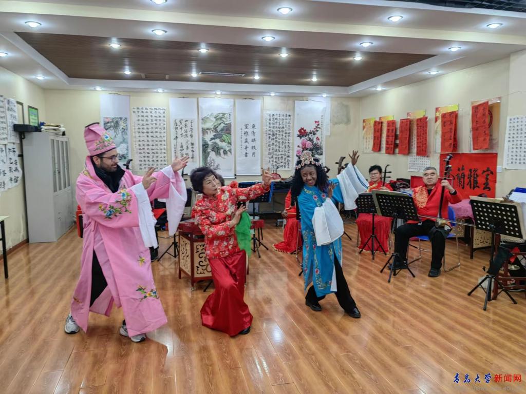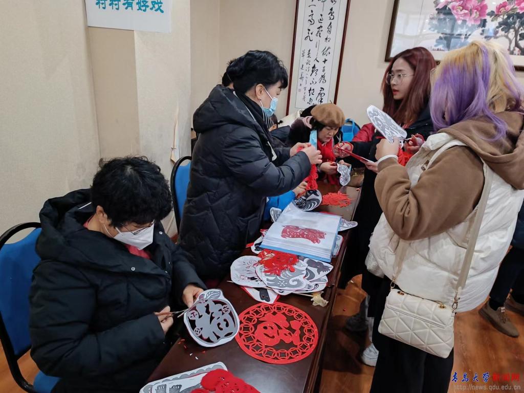留学生们在老年书法家的指导下书写出一张张属于自己的专属“福”字,体验浓浓的中国年味。一副副对联、一张张“福”字让整个现场墨香满溢,浓浓的年味扑面而来。留学生们还在民间艺人的指导下,体验了剪纸、年画拓印制作、扎染、捏糖人等民俗活动,并欣赏了九水路街道民族乐团演奏,在欣赏演出的同时,还近距离参观体验了地方戏吕剧演出的配饰、服饰、演出道具。