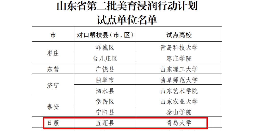 新闻网讯 近日,山东省教育厅公布了山东省第二批美育浸润行动计划试点单位名单,共20所省属高校入围,我校名列其中,对口帮扶日照市五莲县,双方将充分发挥各自资源优势,探索构建高校与城乡学校之间“手拉手”相互学习交流和帮扶机制。