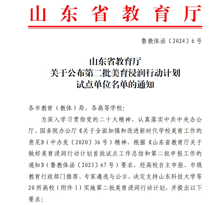 2023年12月,教育部发布《关于全面实施学校美育浸润行动的通知》(教体艺〔2023〕5号), 提出以美育浸润学生、以美育浸润教师、以美育浸润学校,推动形成全覆盖、多样化、高质量具有中国特色的现代化学校美育体系的建设任务。近年来,我校高度重视美育工作,将美育纳入学校整体发展规划,制定加强美育工作的实施方案,成立公共美育中心,构建由美育核心课程、美育选修课程和美育实践活动组成的美育教育体系。依托学校170余间艺术场馆,打造科技文化艺术节、星火艺术展演、浮山美育论坛等美育活动品牌。坚持课堂教学、课外活动、校园文化、艺术展演四位一体实施模式,将“以美育人、以美化人、以美培元”理念纳入人才培养全过程。 此次获批省级美育浸润行动计划试点高校,是对我校美育工作的充分肯定和鼓励,我校将以此次获批为契机,落实建设任务,在美育课程教学、美育实践活动、校园文化建设、美育教师队伍建设等方面为对口单位提供精准帮扶“菜单”,搭建创新协同合作机制,为激发美育教育教学改革发展内驱力、推进学校美育工作整体提升贡献青大力量。