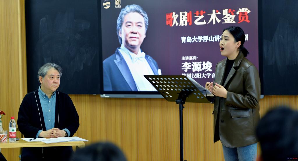 新闻网讯 4月23日,韩国汉阳大学音乐学院李源竣教授应邀做客我校浮山讲堂第94期,在浮山书院大音堂为我校及青岛多所高校热爱音乐艺术的师生带来了一场歌剧艺术鉴赏讲座。讲座由浮山书院卢文丽老师主持,韩国汉阳大学音乐学院声乐系博士生林佳音和梁鹏飞担任讲座助理。