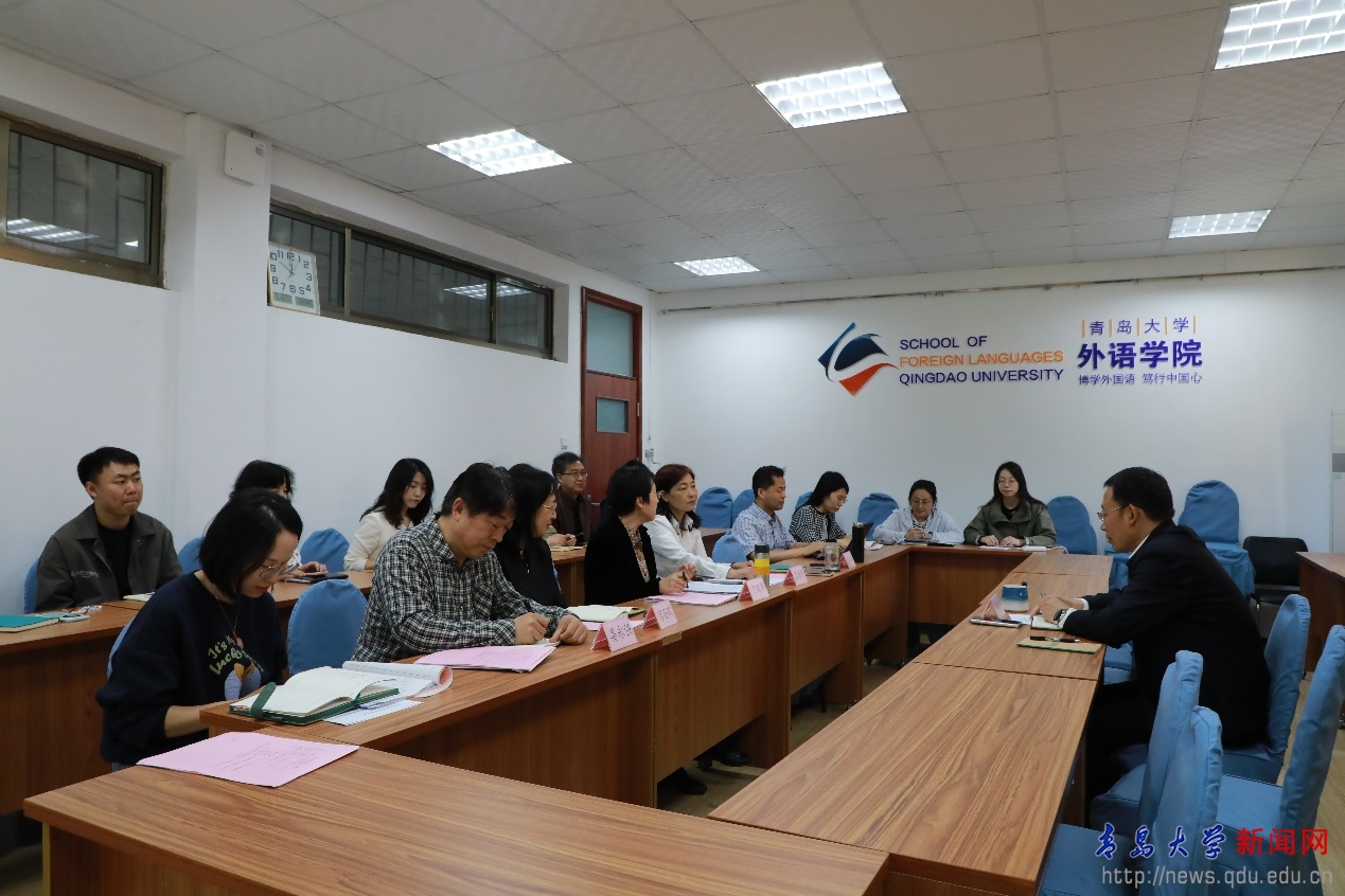 新闻网讯 5月13日上午,副校长刘恩贤到外语学院调研指导工作,学院党政领导班子成员、各党支部书记、各系办中心主任参加座谈交流,外语学院院长卞建华主持会议。