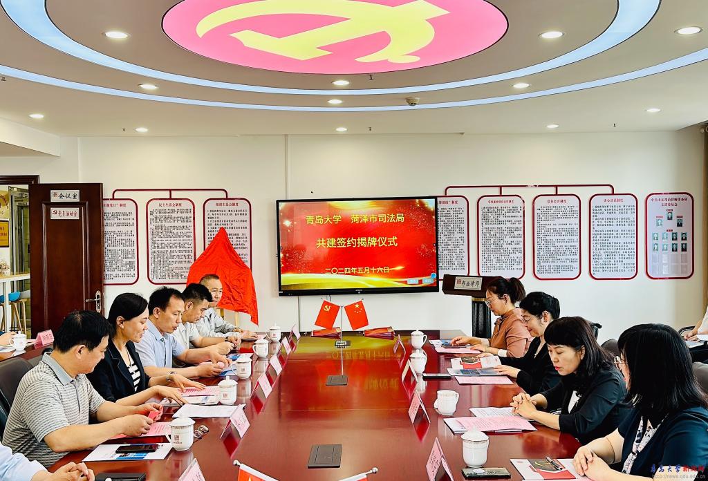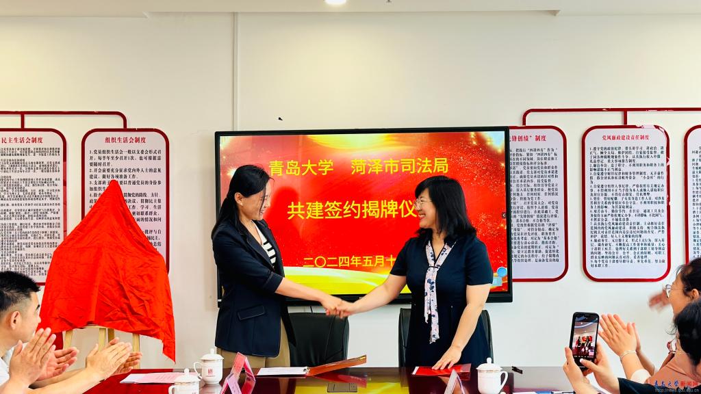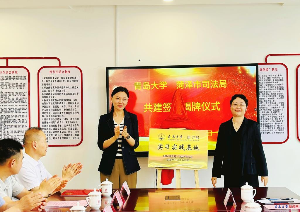 新闻网讯 5月16日,我校与菏泽市司法局合作签约揭牌仪式在山东邦治律师事务所举行。校党委常委刘彩云,法学院院长蔡颖雯,法学院党委副书记甄淑华,菏泽市司法局党组书记、局长、二级巡视员乔方臣,菏泽市司法局党组成员、政治部主任、菏泽市律师行业党委书记刘青,菏泽市律师协会会长陈会领,山东邦治律所主任张雅维等参加仪式。