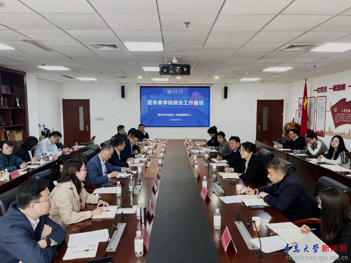 新闻网讯 为深化医学教育改革,提升人才培养质量,全力推进毕业生高质量就业。5月7日,校党委常委、副校长陈涛率队赴浮山校区浩园医学教育综合楼召开专题座谈会,全面部署2025届医学类毕业生就业工作。学生工作处、青岛医学院等6个医学医药类教学单位及临床医学院负责同志、分管就业同志参加会议,青岛医学院党委书记蒋光峰主持会议。