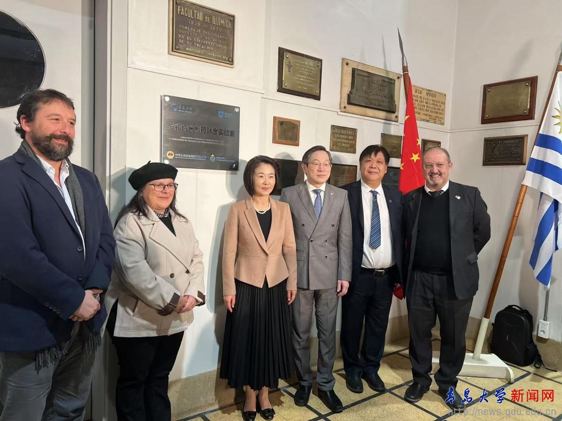 在我校与乌拉圭共和国大学共建的中国-乌拉圭生物纳米制药联合实验室启动仪式上,中国科技部副部长林新、乌拉圭教育和文化部副部长加芙列拉·贝尔德、中国驻乌拉圭大使黄亚中、乌拉圭共和国大学代理校长蒙布鲁、我校副校长李荣贵等共同为实验室揭牌。