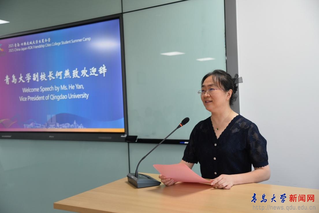 7月12日,夏令营欢迎仪式在我校会议中心隆重举行。校党委常委、副校长何燕代表学校向远道而来的日韩师生致以热烈欢迎,她表示,青岛与日韩地缘相近、人文相通,我校充分发挥区位优势,长期以来积极推进与日韩高校的交流合作。希望参营的三国大学生在对话中增进理解,在合作中激发创新,在互动中深化友谊。