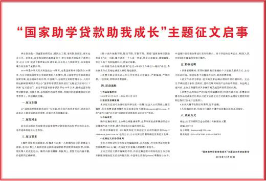 2.除小说外体裁不限,题目不限,字数不限。围绕“国家助学贷款助我成长”这一主题,集中讲述一个人或一件事,要求内容真实,感情真挚,突出人物个性和独特经历,传递正能量。