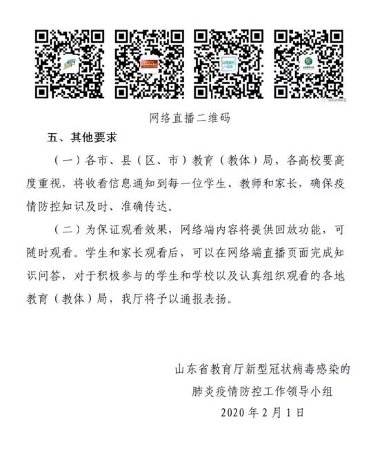附:《山东省教育厅新型冠状病毒感染的肺炎疫情防控工作小组关于组织收看疫情防控特别节目的通知》(鲁教疫控组字[2020]5号)文件